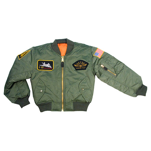 Veste de pilote pour enfant de type Bomber dans le style Top Gun, avec des écussons stylés.