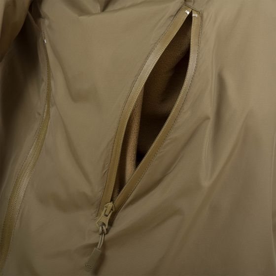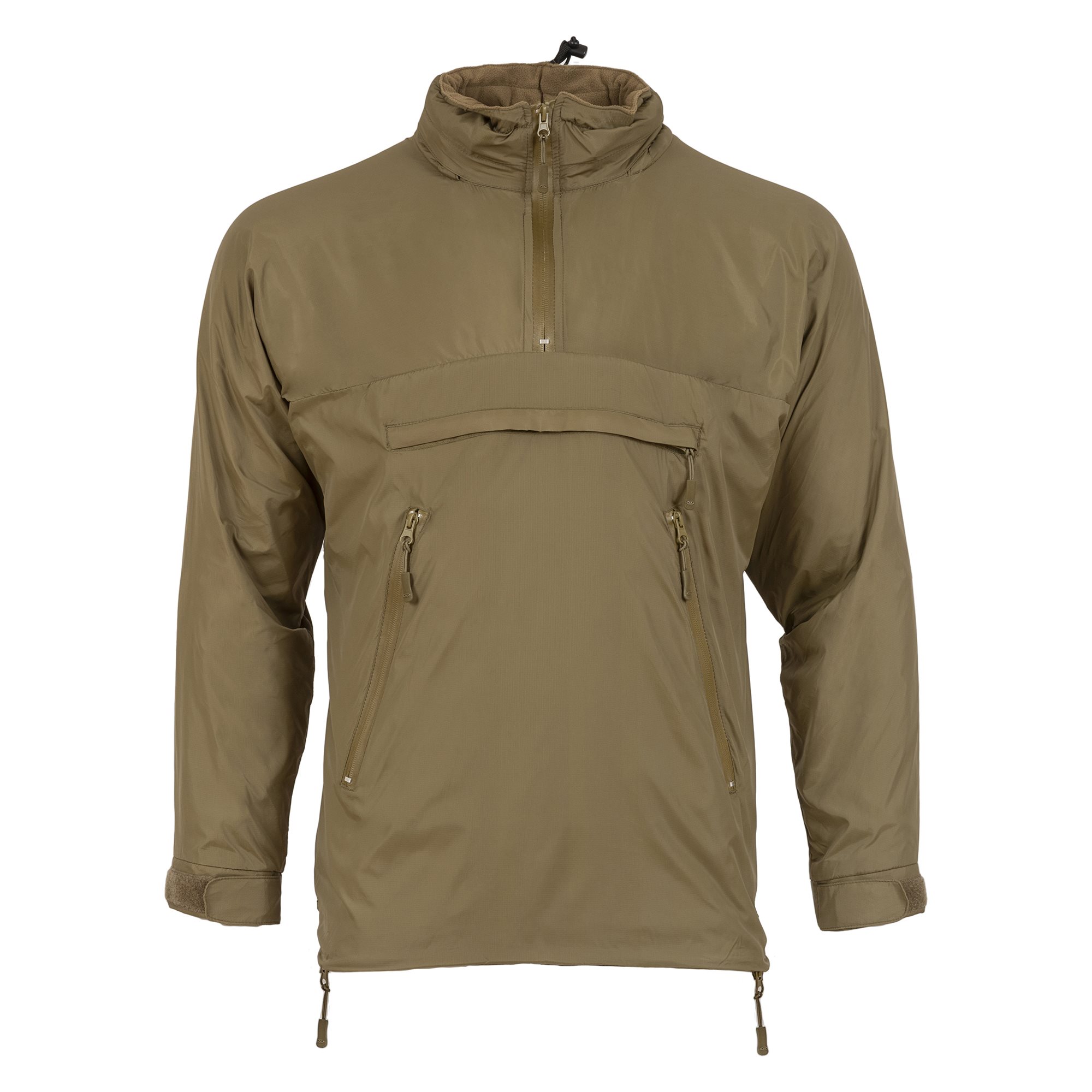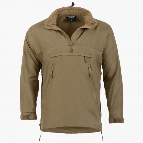 Anorak léger et compact, fabriqué selon le modèle PCS Thermal Smock de l'armée britannique. Il constitue une alternative aux sweats à capuche ou aux pulls en polaire. En hiver, il sert de deuxième couche de vêtement, tandis que dans des conditions moins froides ou en cas de détérioration soudaine des conditions météorologiques, il constitue la couche extérieure. La couche extérieure en nylon avec coutures étanches et revêtement en téflon protège du vent et de la pluie légère, tandis que la doublure en polaire retient la chaleur corporelle. Toutes les fermetures éclair sont imperméables ou recouvertes d'un rabat.