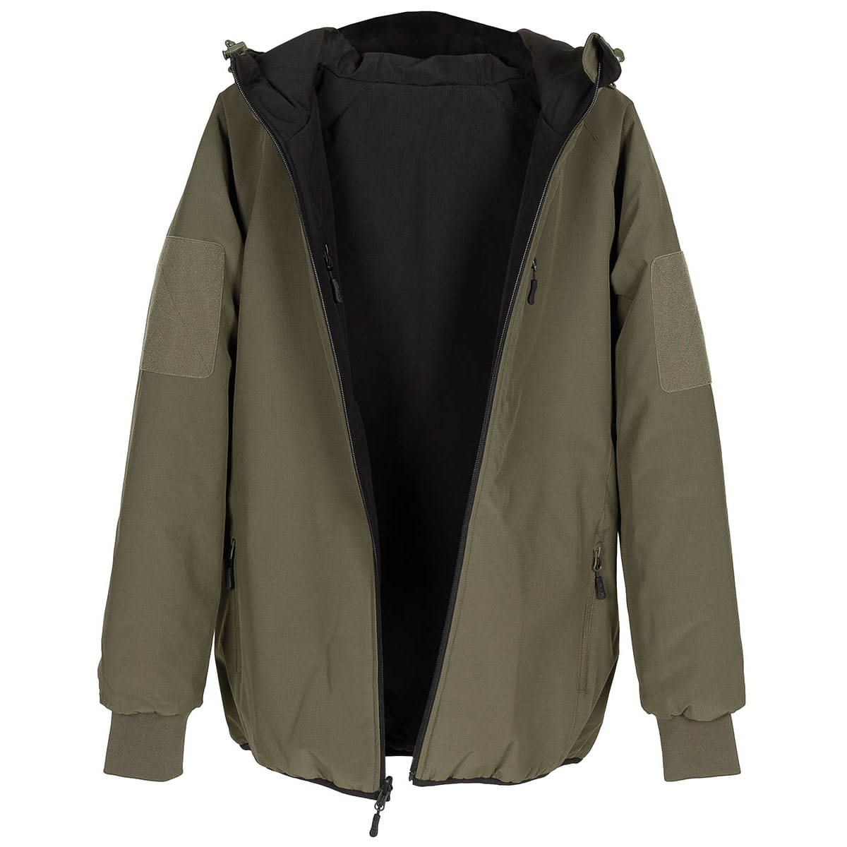 La fermeture est assurée par une longue fermeture éclair YKK centrale terminée par un protège-cou dans le col. La capuche de la veste est relativement profonde et peut être ajustée à l'aide d'un cordon avec un bloqueur en plastique. Pour ranger vos petits accessoires, vous pouvez utiliser une poche poitrine avec fermeture éclair verticale et deux poches à la taille. Les poignets des manches sont terminés par un tricot élastique, tout comme l'ourlet inférieur. Le côté vert de la veste est équipé de deux panneaux velcro pour la personnalisation à l'aide d'écussons VELCRO.