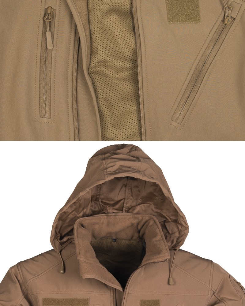 La veste se ferme à l'aide d'une fermeture éclair centrale à double sens avec un rabat intérieur anti-vent, tandis que la fermeture éclair du col est terminée par une petite protection pour le menton, le cou et la barbe. Le col de la veste est doublé d'une polaire agréable et chaude et cache une capuche fixée par du velcro. Les poches pour les mains ont des ouvertures assez larges et peuvent facilement contenir de petits équipements. Les deux poches poitrine sont fermées par des fermetures éclair, la poche gauche offrant un peu plus d'espace pour ranger vos affaires. Au-dessus des poches poitrine, vous trouverez deux bandes Velcro pour vos écussons et étiquettes VELCRO. Vous trouverez une autre paire de panneaux VELCRO sur les deux épaules de la veste, la bande velcro de l'épaule gauche étant cousue sur une petite poche fermée par une fermeture éclair. La dernière poche se trouve à l'intérieur gauche. Cette poche est idéale pour ranger des objets de valeur tels que des documents ou un téléphone portable. Les poignets des manches sont bien sûr réglables à l'aide de velcro et le bas de la veste est réglable à l'aide d'un cordon avec bloqueur.