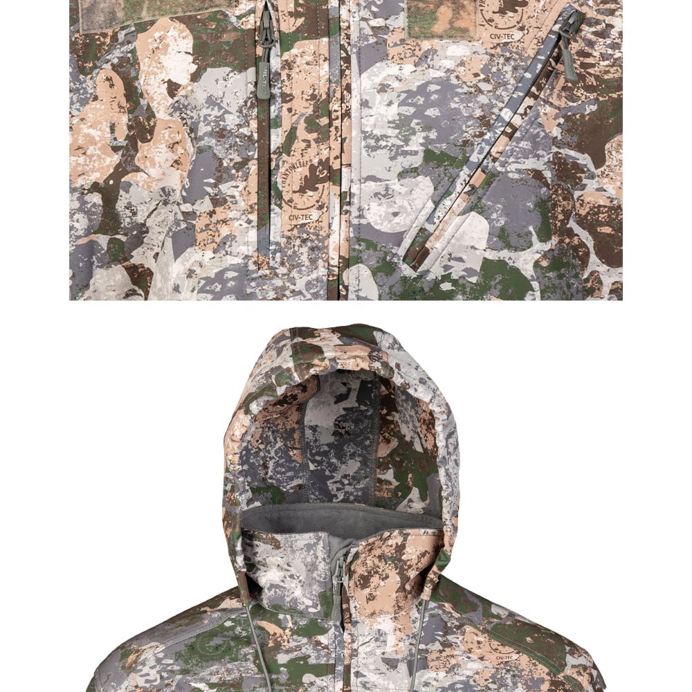 La veste se ferme à l'aide d'une fermeture éclair centrale à double sens avec un rabat intérieur anti-vent, tandis que la fermeture éclair du col est terminée par une petite protection pour le menton, le cou et la barbe. Le col de la veste est doublé d'une polaire agréable et chaude et cache une capuche fixée par du velcro. Les poches pour les mains ont des ouvertures assez larges et peuvent facilement contenir de petits équipements. Les deux poches poitrine sont fermées par des fermetures éclair, la poche gauche offrant un peu plus d'espace pour ranger vos affaires. Au-dessus des poches poitrine, vous trouverez deux bandes Velcro pour vos écussons et étiquettes nominatives. Vous trouverez une autre paire de panneaux VELCRO sur les deux épaules de la veste, la bande velcro de l'épaule gauche étant cousue sur une petite poche à fermeture éclair. La dernière poche se trouve à l'intérieur gauche. Cette poche est idéale pour ranger des objets de valeur tels que des documents ou un téléphone portable. Les poignets des manches sont bien sûr réglables à l'aide de velcro et le bas de la veste est réglable à l'aide d'un cordon avec bloqueur.
