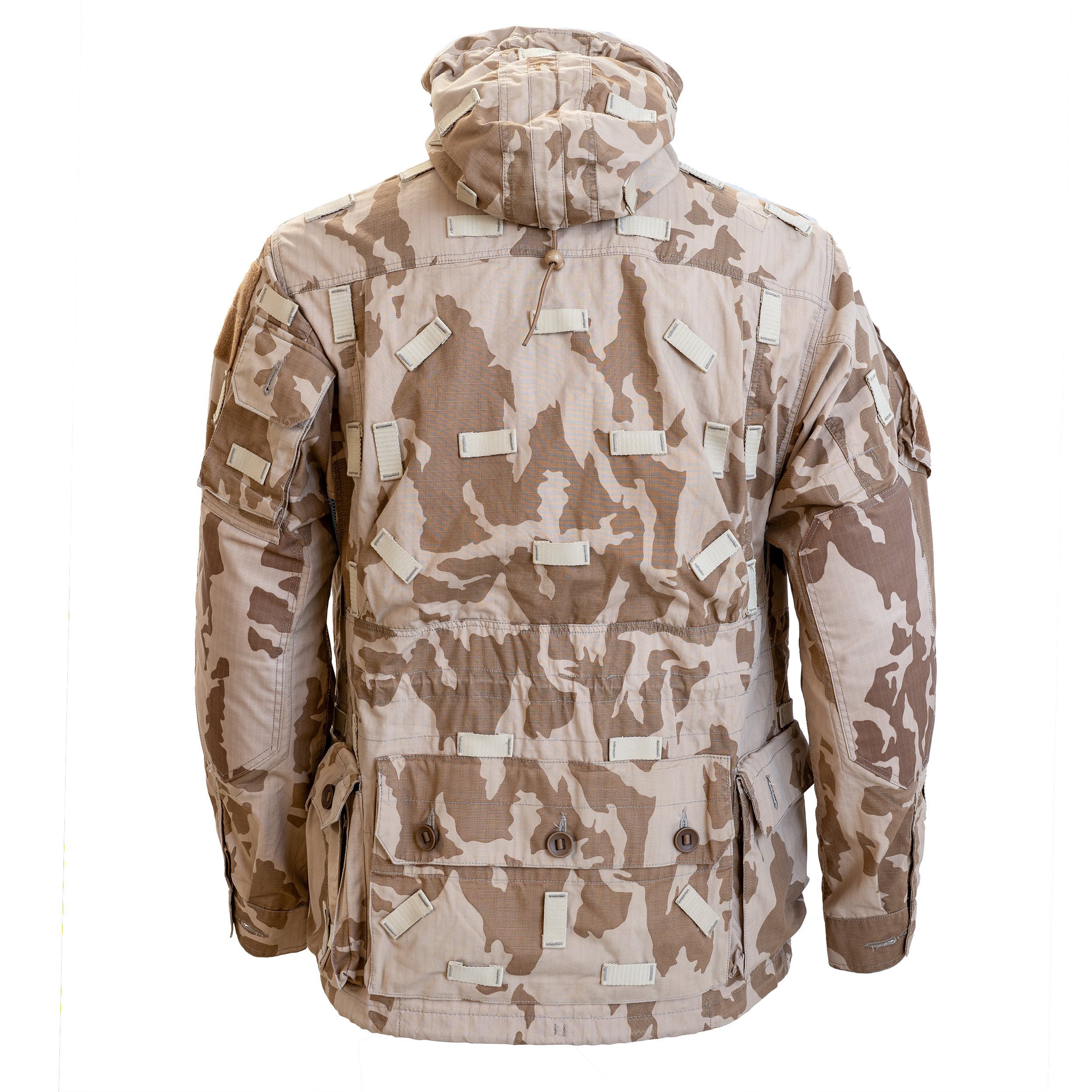 Veste de type « smock » avec capuche ajustable, boucles pour fixer le camouflage et nombreuses poches pour ranger un grand volume d'équipement. Plus d'informations