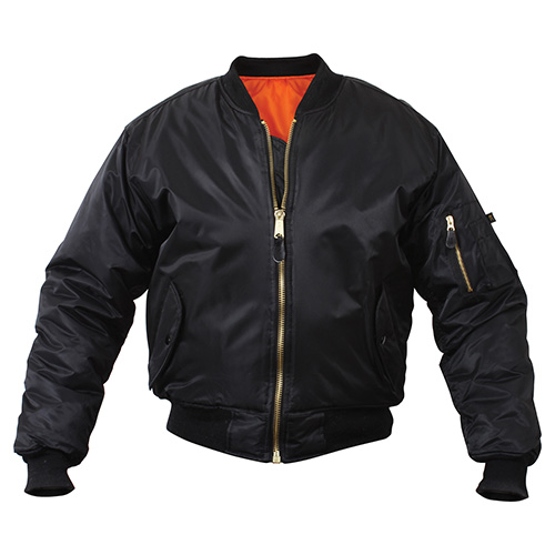 Veste pilote imperméable classique de type MA-1 (bomber). Ce modèle a été introduit dans l'équipement de l'US Air Force au milieu des années 50 et a conservé sa popularité jusqu'à aujourd'hui. La veste est isolée et convient aux températures plus froides. Elle est réversible, avec une doublure orange vif à l'extérieur qui lui confère une couleur réfléchissante pour les situations d'urgence.