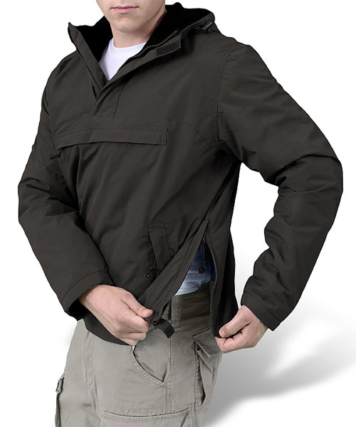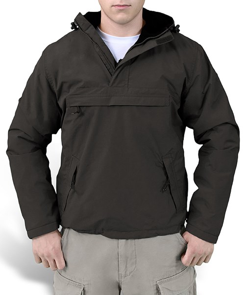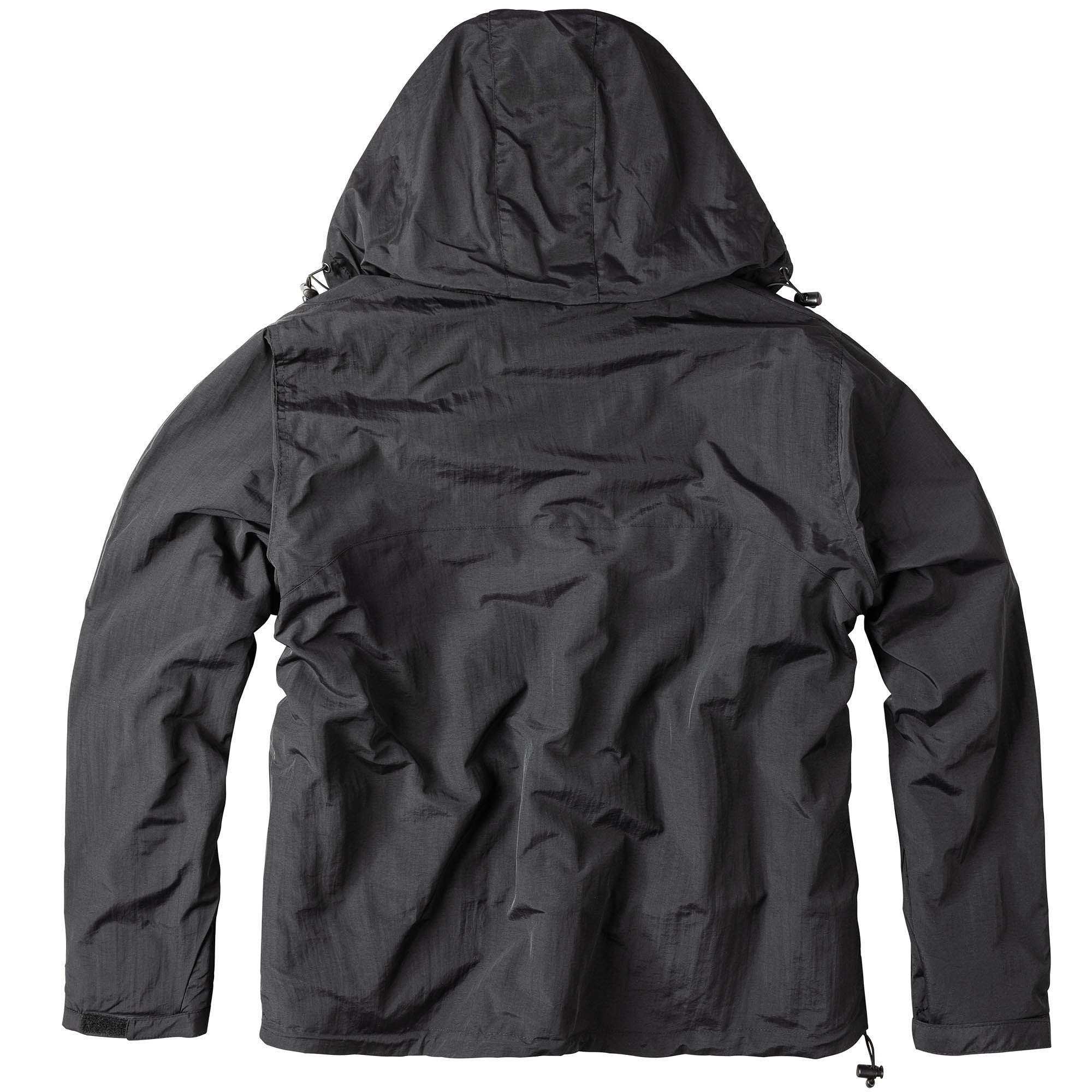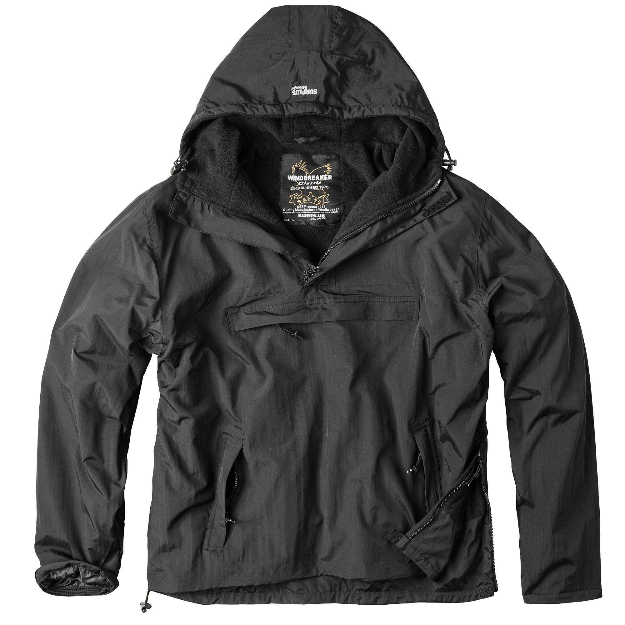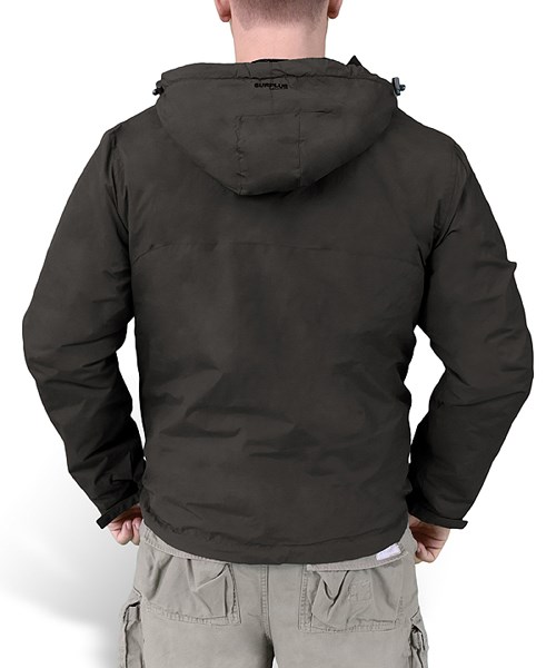 Veste coupe-vent Surplus Windbreaker légère, respirante et imperméable grâce à sa surface en nylon. Elle est équipée d'une fermeture éclair courte et s'enfile par la tête. Cette conception renforce encore davantage sa résistance au vent. Toutes les poches (une grande sur la poitrine et deux sur les côtés) sont équipées d'une fermeture éclair et sont recouvertes d'un rabat. Le col montant protège bien le cou, la capuche est réglable par un cordon. La largeur de la taille peut être ajustée à l'aide d'un cordon élastique, la largeur des poignets à l'aide d'une bande Velcro. Sur le côté gauche de la veste se trouve une fente zippée qui permet d'accéder plus facilement à la poche du pantalon.